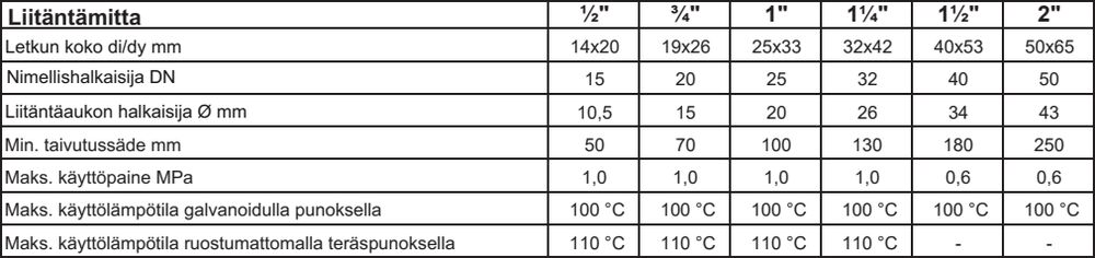 Materiaali: Sisäletku: EPDM-kumia mitoissa d.int/d.ext 14x20 mm - 50x65 mm alla olevan taulukon mukaisesti