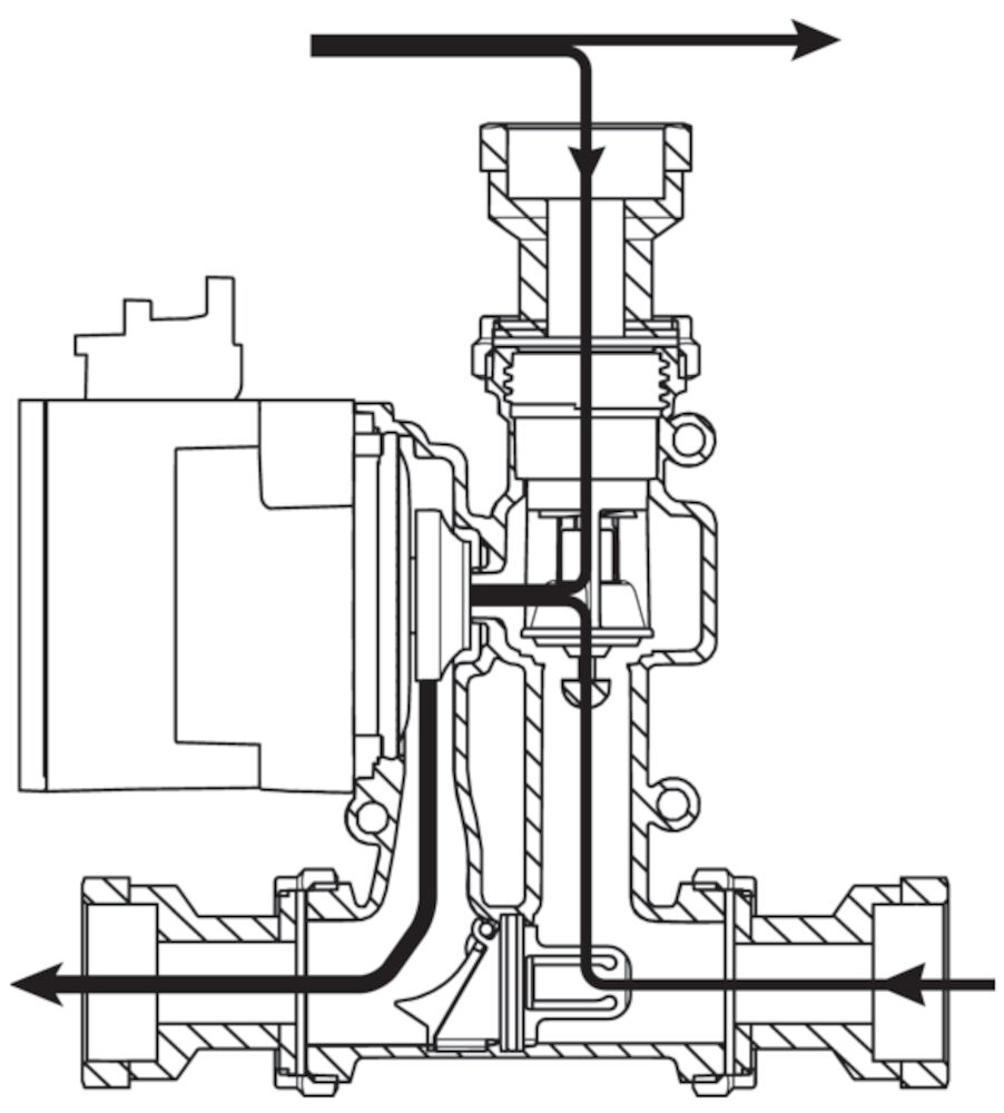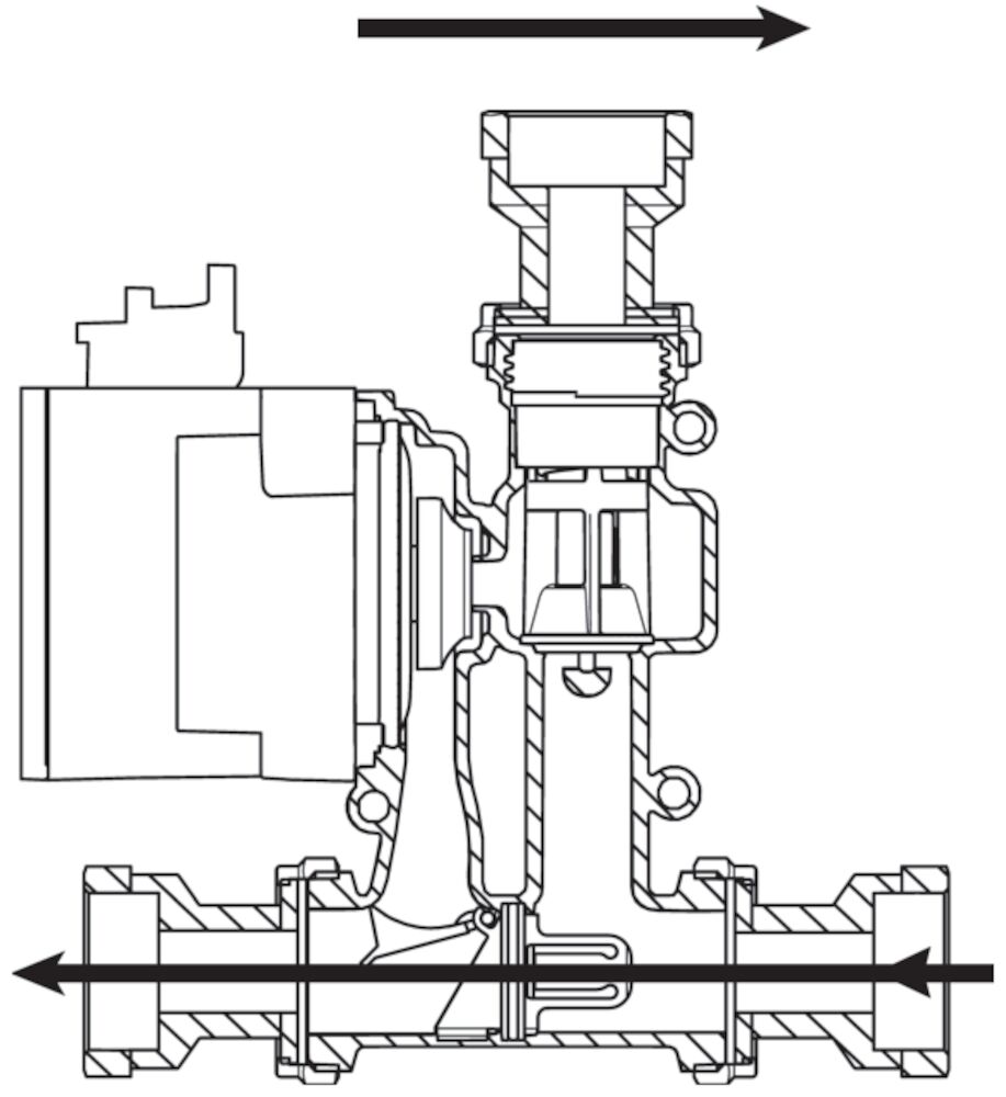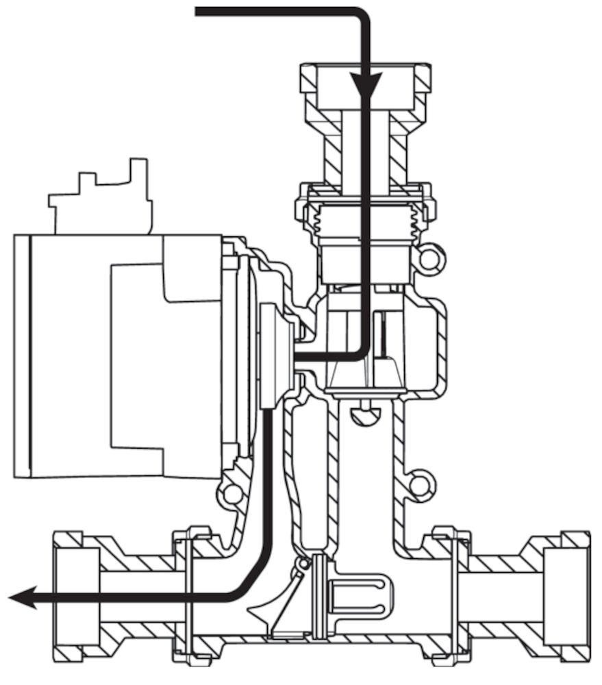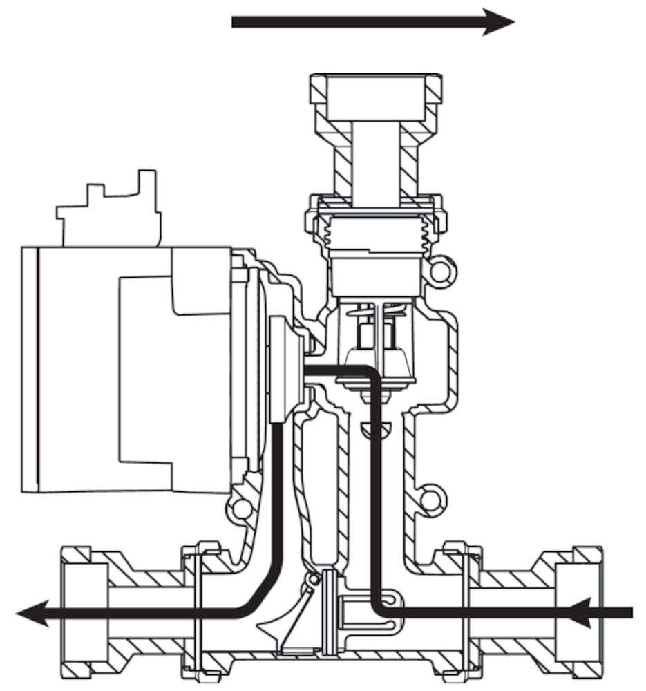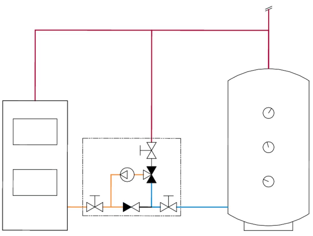 Termostaattielementti on täysin avautunut ja ohitusjohto pysyy suljettuna. Tuloksena on paras mahdollinen lämmönsiirto kattilasta, ja varaaja täyttyy menovedellä.