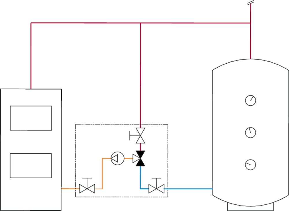 Termostaattielementti alkaa avautua ja varaajasta tuleva paluuvesi sekoittuu menoveteen ennen veden paluuta kattilaan. Paluulämpötila kattilaan pidetään vakiona.