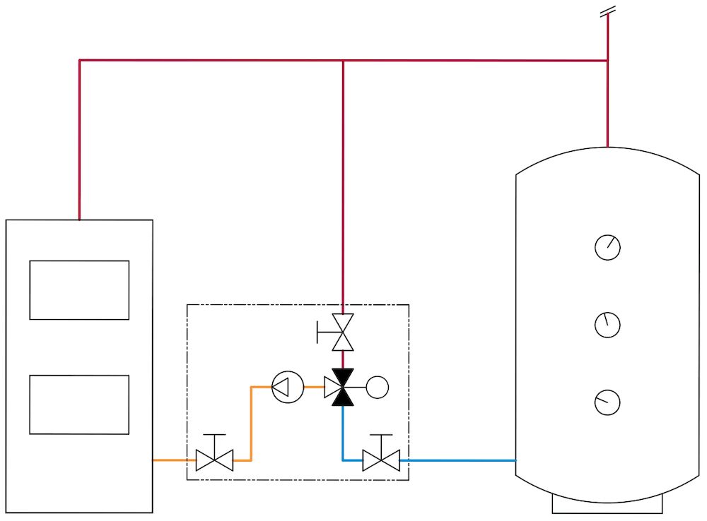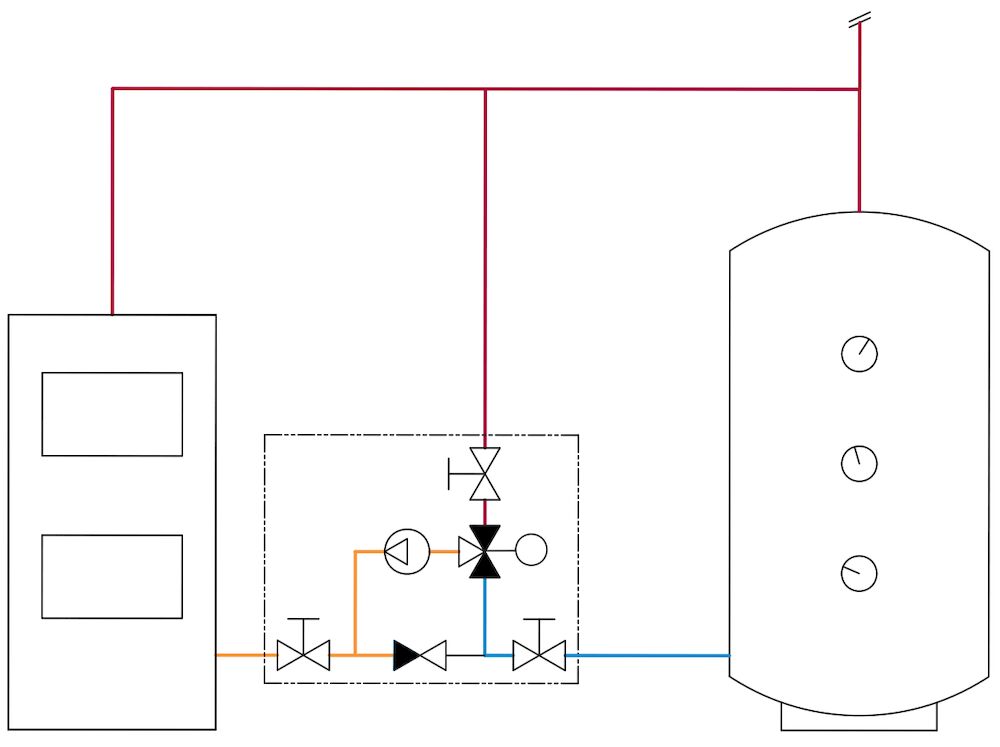 Sekoitusventtiili on täysin auki kohti varaajaa. Tuloksena on paras mahdollinen lämmönsiirto kattilasta, ja varaaja täyttyy menovedellä. Kun kattila on jäähtynyt, LK 100 SmartComfort CT:n säätöautomatiikka estää virtauksen varaajasta takaisin kattilaan.