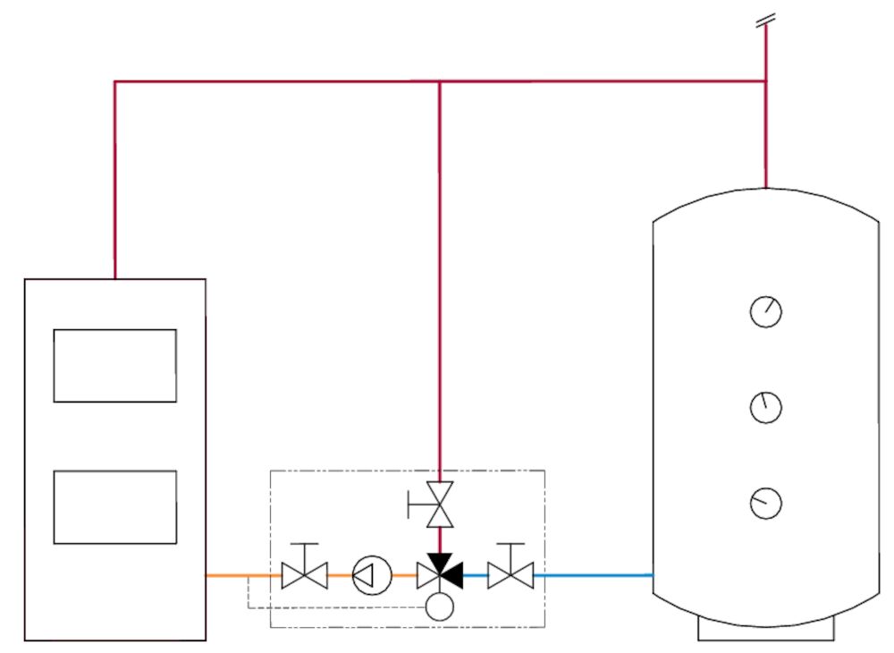 Sekoitusventtiili on täysin auki kohti varaajaa. Tuloksena on paras mahdollinen lämmönsiirto kattilasta, ja varaaja täyttyy menovedellä. Kun kattila on jäähtynyt, säätöautomatiikka estää virtauksen varaajasta takaisin kattilaan.