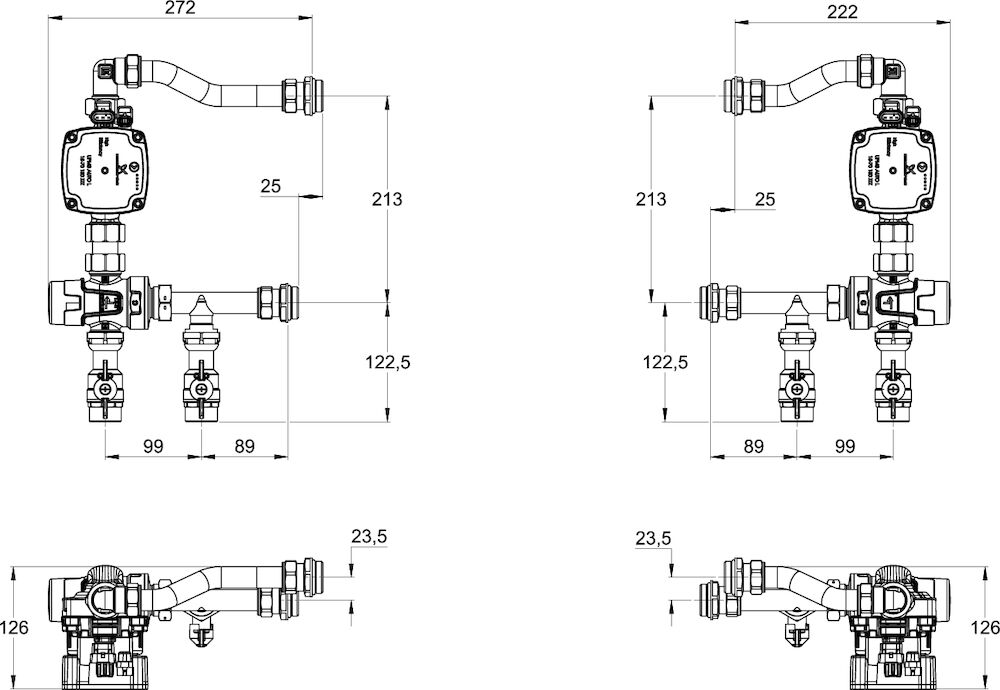 Shunttiryhmä voidaan asentaa sekä oikealle että vasemmalle suoraan LK 430 -lämpöpiirijakajaan.