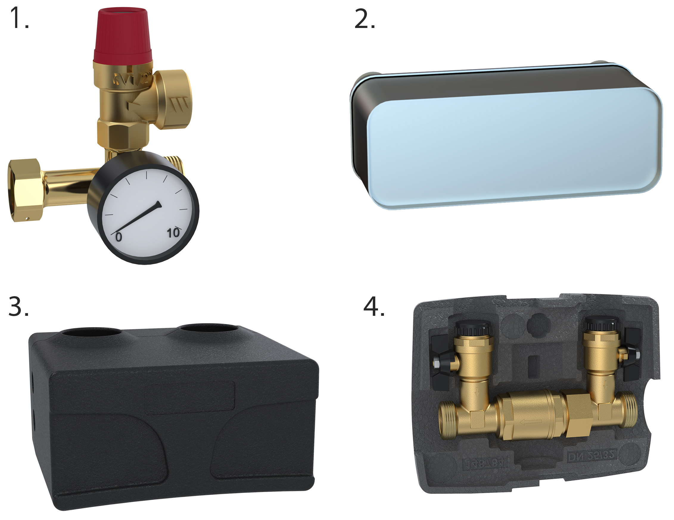 Kohdasta varaosat ja lisävarusteet löytyy turvaryhmä tuotenumerolla 092394, joka sisältää painemittarin, varoventtiilin (3 bar) sekä liitännän paisunta-astialle ja yhteyden lämmönvaihtimeen.
