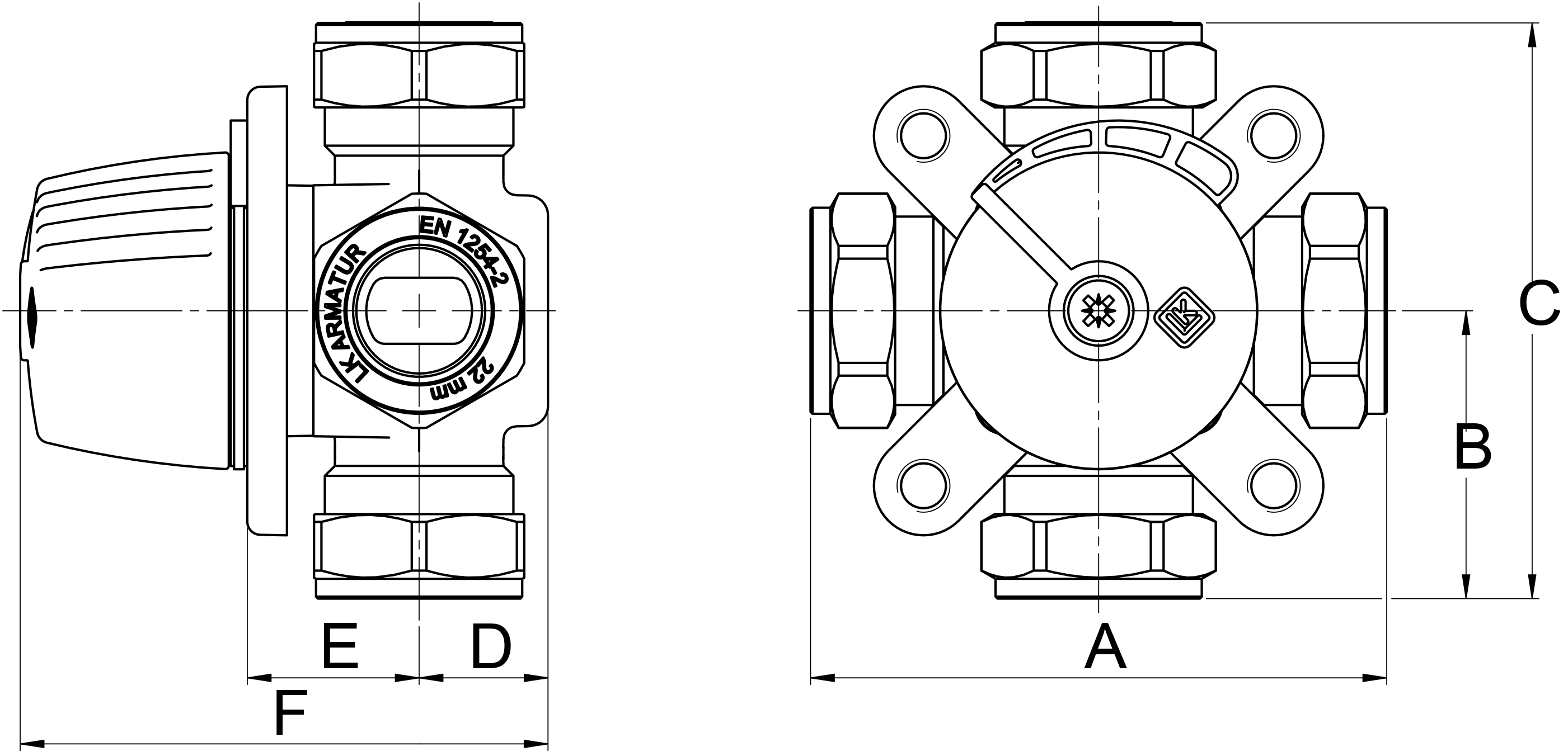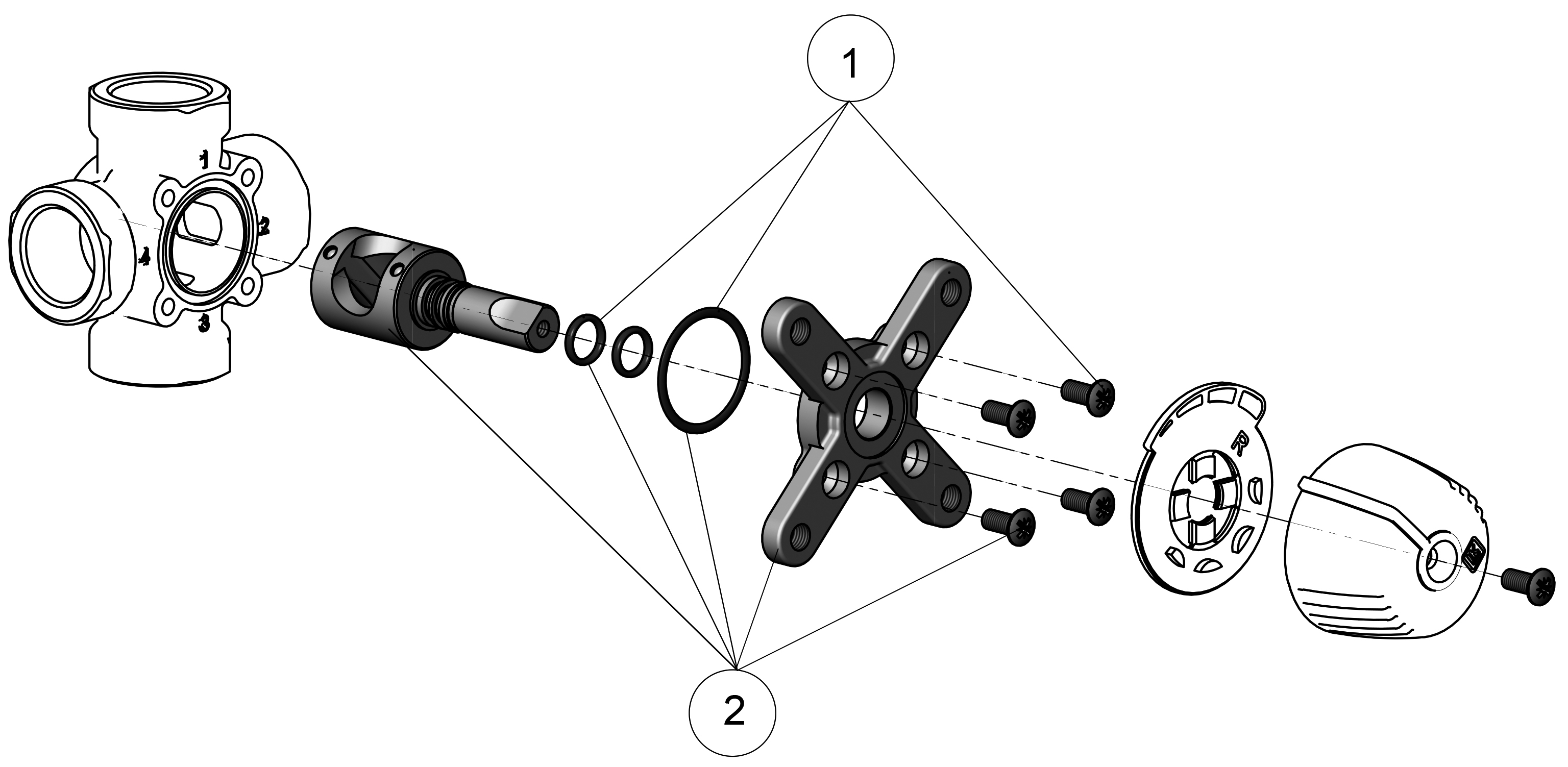 Venttiilin voi asentaa mihin asentoon tahansa. Liitäntäportit on merkitty 1–4. Vakiona venttiili asennetaan seuraavasti: 1=meno, 2=toisiolämpö, 3=ensiölämpö ja 4=paluu.