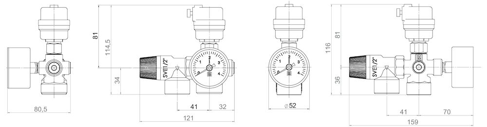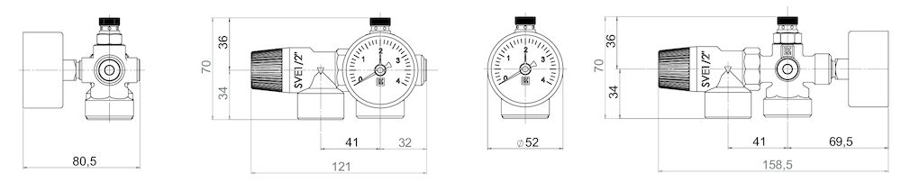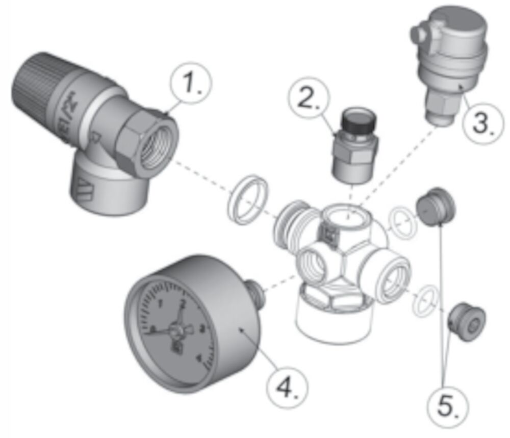 Manometri, kelluva ilmanpoistin ja yksi ½" liitäntä jakotukissa on varustettu PTFE-tiivisteellä. Varoventtiilejä muissa paineenluokissa on saatavana pyynnöstä.